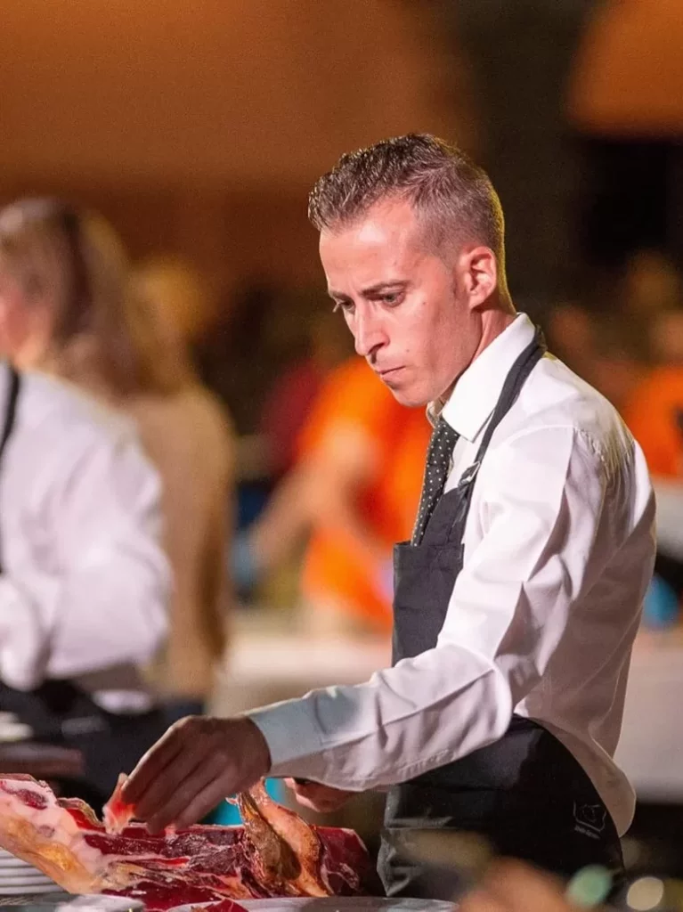 Uno de los momentos más especiales de nuestros eventos es la intervención del maestro cortador. Su técnica, avalada por premios nacionales e internacionales, aporta un carácter didáctico y artístico que enriquece enormemente la experiencia. Cortar jamón de forma profesional no es solo una habilidad: es una forma de narrar la cultura que rodea al producto, de mostrar cómo cada loncha puede expresar zonas, aromas y texturas distintas. Los asistentes no solo degustan, sino que descubren.